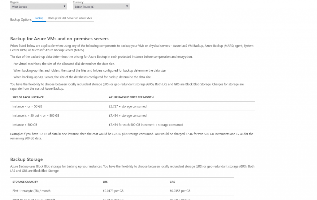 We also have the Backup for Azure VMs and on-premises servers which is the cost for the Backup Service and we have the Backup Storage which is the cost just for the Account storage.