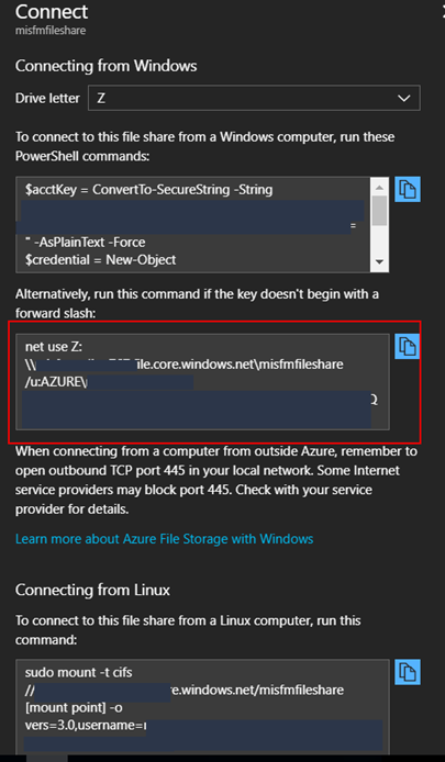 net use Z: \\ STORAGE-ACCOUNT-NAME.file.core.windows.net\misfmfileshare /u:AZURE\ STORAGE-ACCOUNT-NAME