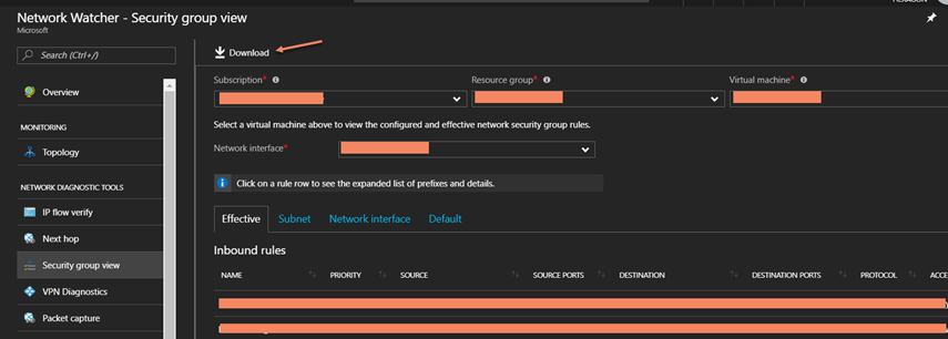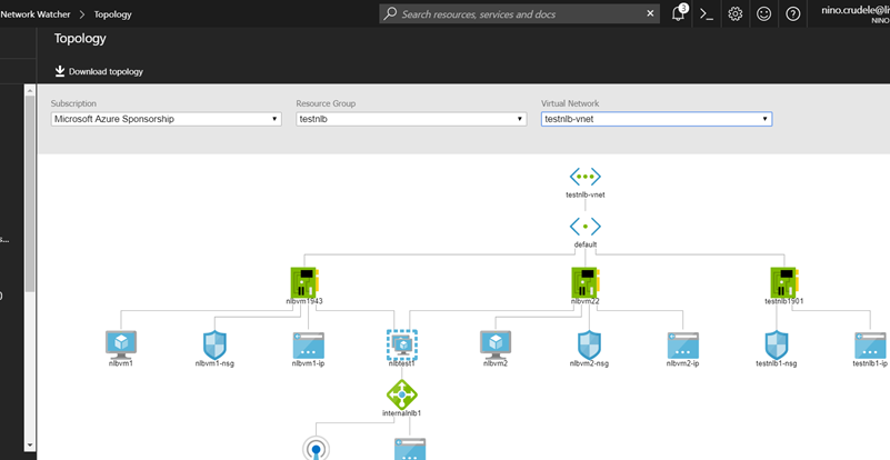 This is very useful to understand how the network is composed, select Network Topology, the subscription, NSG and VN and you will have all the topology, you can also download the SVG file.