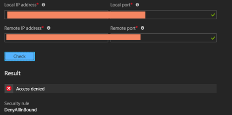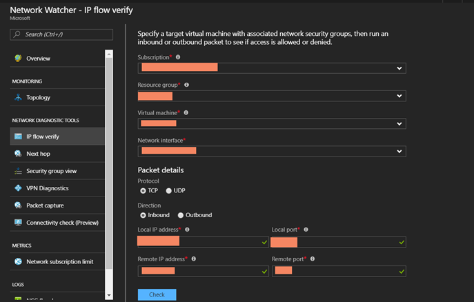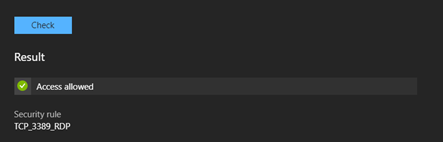 In order to do that we need to select IP flow verify, select our NSG, VM as before and we can start checking our ports, for example we can start checking or RDP connectivity like below
