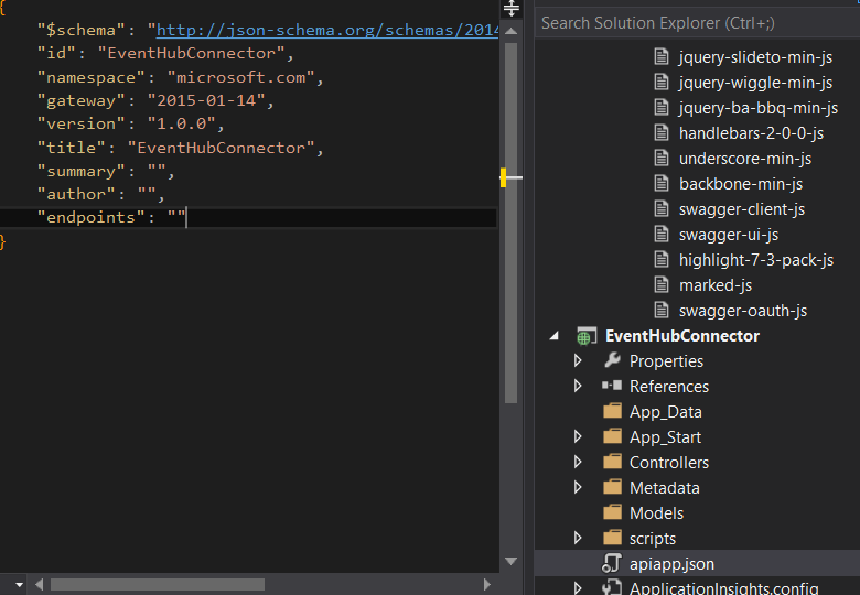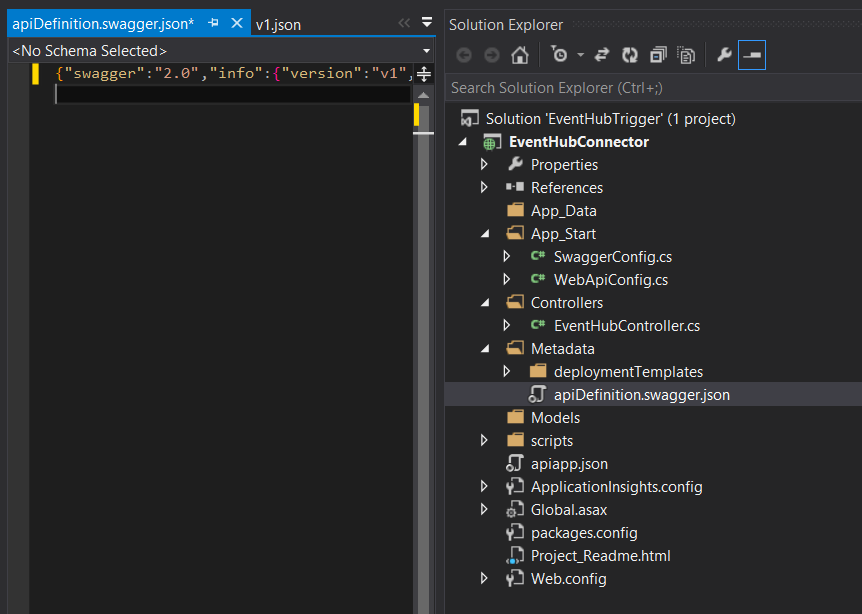Open the file in Visual Studio, create a file named apiDefinition.swagger.json Metadata folder and save the content inside the file.