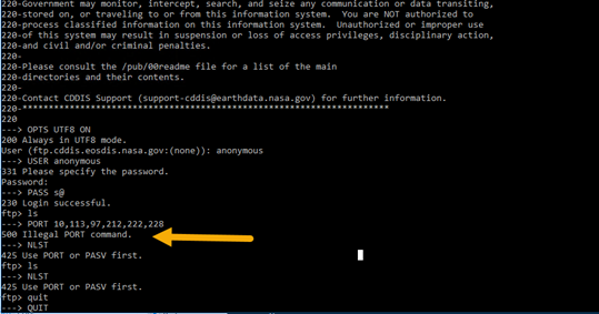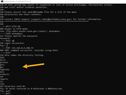 People asked me to investigate to an issue, the ftp.exe command was able to log to cddis.gsfc.nasa.gov but, after that, no way to execute ftp commands from the Azure VM, for example like the ls command, see below.
