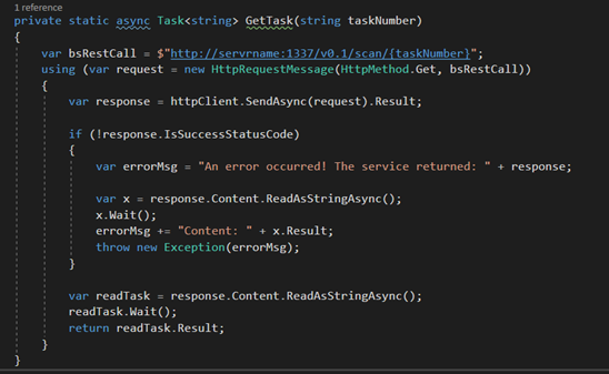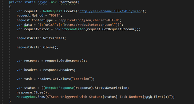 The code below returns the scan status and the task number in the HTTP header (not sure why it is named Location)