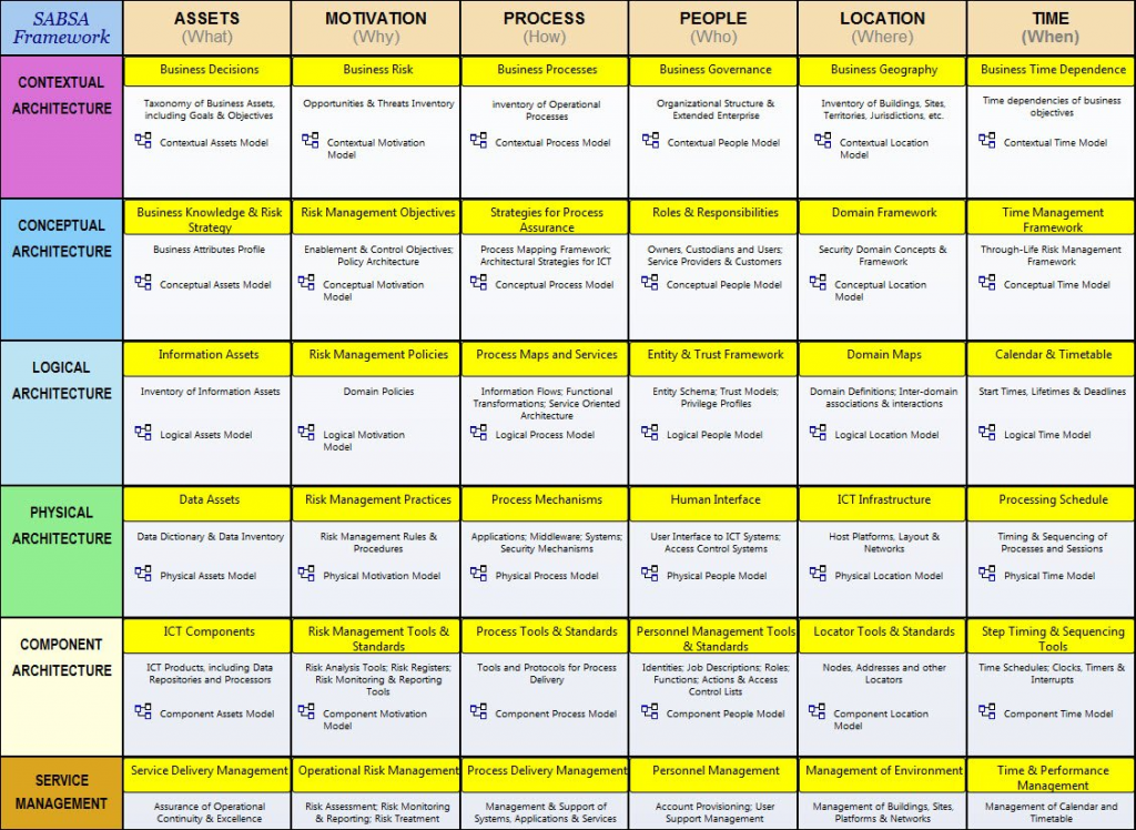 The usage of tools like the Sherwood Applied Business Security Architecture (SABSA) can drastically help a company to achieve that. SABSA helps the company to navigate across all these layers increasing the details in each one.