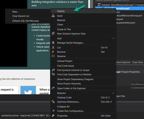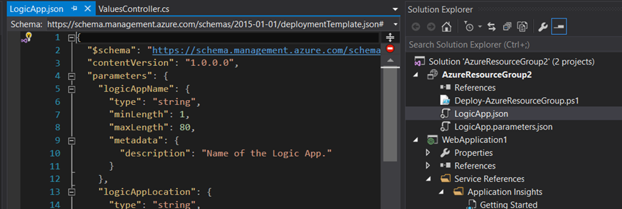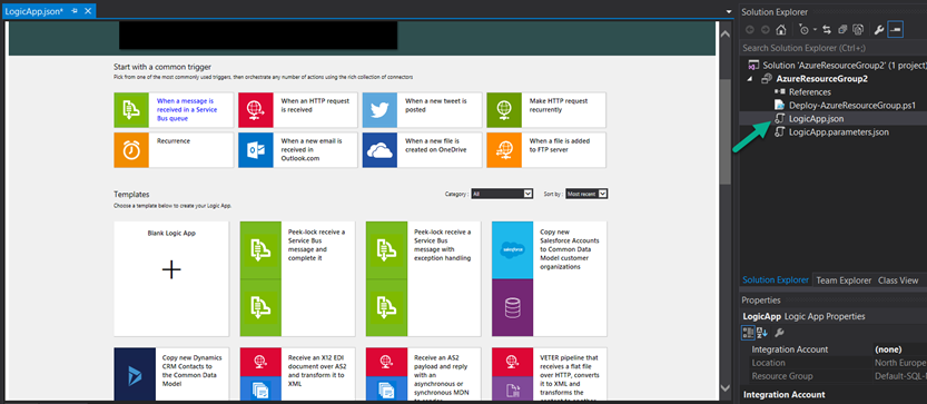 In Visual Studio we have two main options, using the designer just selecting the LogicApp.json file, right click and “Open using the Logic App designer” or directly using the JSON file.