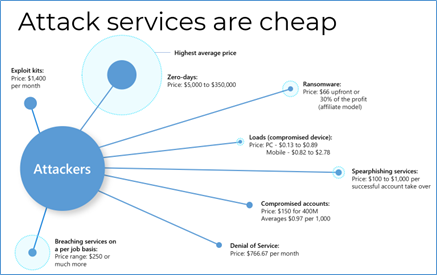 As you can observe from the diagram, attacks like DOS, and fishing are very cheap, and it is impressive to see the price for a ransomware attack is extremely cheap.