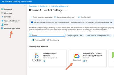 Select Enterprise Application, click on New Application and search for Google.