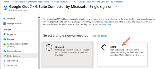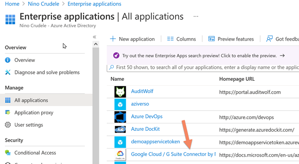After installing it, select the Google Cloud / G Suite Connector by Microsoft in Enterprise Applications