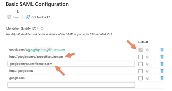 Below the settings is the Identifier Entity ID. These entities are used during the authentication process by both domains. The Microsoft Domain will become a SAML token to Google Workspace, which will reply with an Entity ID. In the case of Google, the first exchange will use the primary domain in the SAML token. This is the reason why it is important to specify it and set it as default.