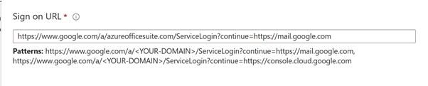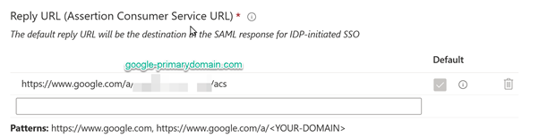 The reply token from Google will also require the primary domain. An important note, you can see below that the reply I set is not corresponding to the pattern suggested by the tool. During my tests, I faced some errors, and I discovered that the value set in the SAML token was different from what was suggested in the documentation.