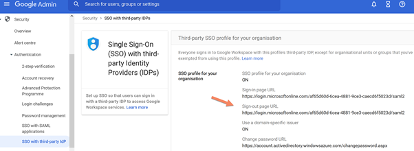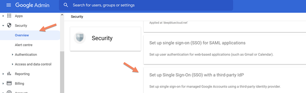 Enter in the Google Workspace and click on Security and click on Single Sign-On (SSO) with third-party Identity Providers (IDPs).
