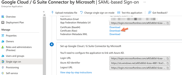 Set all the values following the specification below, and you can find all the values to use in the Azure AD; also download the raw certificate to use in Google Workspace, below the Azure AD side.