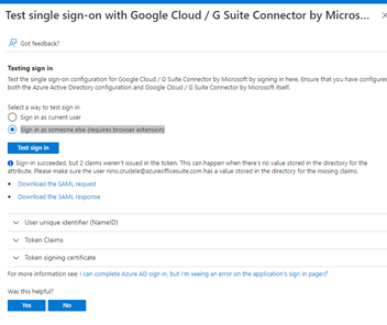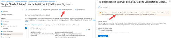We can test the integration by clicking on Test this application, and we can find this in the Single sign-on setting of the G-Suite application in Azure AD.