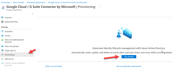To enable the auto-provisioning, we need to navigate in the G-Suite enterprise application in Azure AD and select provision.