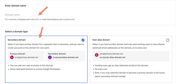 Enter the domain name and set a secondary domain