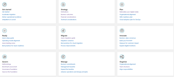 As you can see, the framework is organised in specific areas, and the idea is to provide guidance across a journey into the cloud.